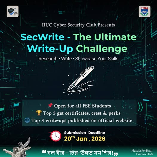 IIUC Cyber Security Club presents SecWrite β The Ultimate Write-Up Challenge, a technical writing competition where students explore cybersecurity topics through research-based, practical write-ups. Participants must explain a chosen concept, highlight its real-world relevance, and demonstrate implementation using tools, workflows, or code examples.